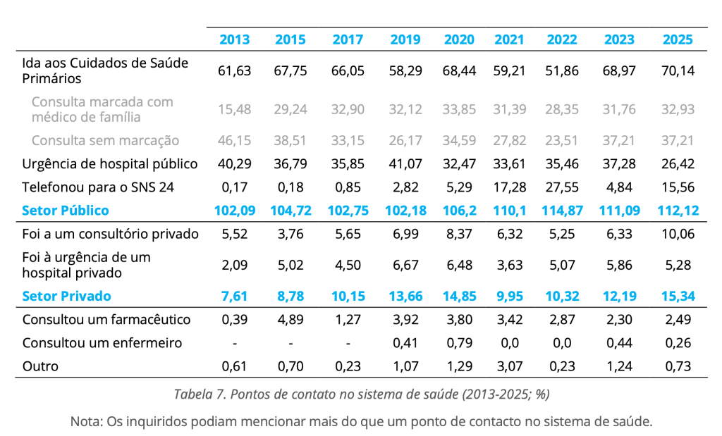 Referência: Barros, P., & Santos, C. (2025). Acesso a Cuidados de Saúde 2025. Nova School of Business and Economics. https://doi.org/10.34619/sxve-zeke (a descrição metodológica da população inquirida pode ser encontrada no relatório)