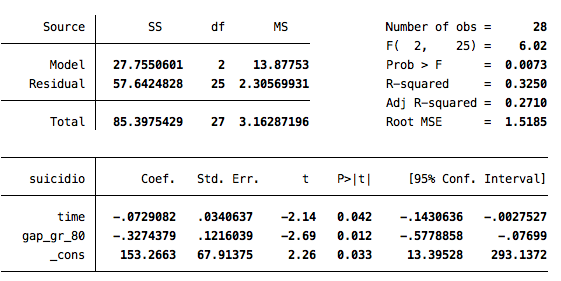 relação entre a taxa de suicídio e indicador de conjuntura (1980-2010): negativa, depois de descontada a tendência geral de redução da taxa de suicídio.