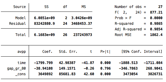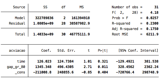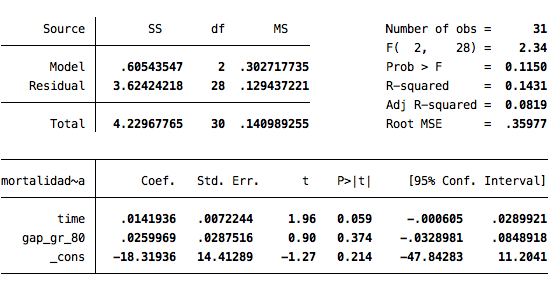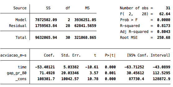 Os quadros referentes a essas regressões, usando todas as observações anuais disponíveis desde 1980, corroboram as conclusões da análise gráfica. (nota: alargar o período temporal não afecta as conclusões; para os anos de vida potenciais perdidos há observações em falta nos últimos 5 anos).