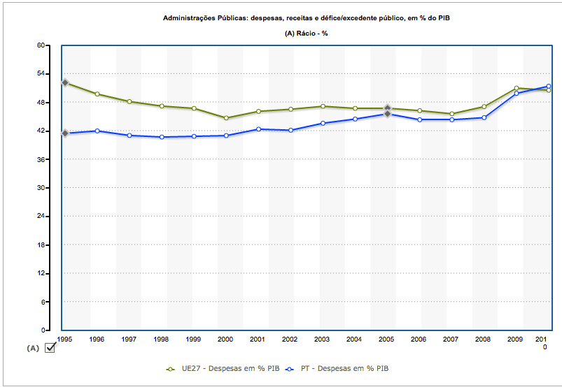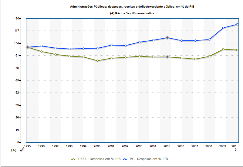 o peso do estado na economia pode ser medido de várias formas; uma das mais informativas é o peso da despesa pública sobre o PIB, seja em % seja em número índice que dá a evolução a partir de um ano base. As duas figuras no final deste post dão essa evolução em Portugal e na Europa a 27, desde 1995 até 2010. É visível o aumento desse peso do estado na economia portuguesa. Mas ainda assim, esta é uma sub-estimação do verdadeiro peso do estado sobre a economia. Estes rácios são valores médios, mas em termos de incentivos económicos poderá ser mais interessante olhar em termos marginais e em termos de efeito sobre consumos intermédios relevantes. Sem ter a pretensão de um tratamento exaustivo, dois exemplos ilustram como o peso do estado sobre o desenvolvimento da economia pode ser bem superior ao que o valor médio sugere, na medida em que o crescimento e desenvolvimento de actividades é tributado a uma taxa mais elevada do que se poderia supor à partida. O primeiro exemplo é de consumo de electricidade, o segundo do mercado de trabalho (a detalhar em post futuro).