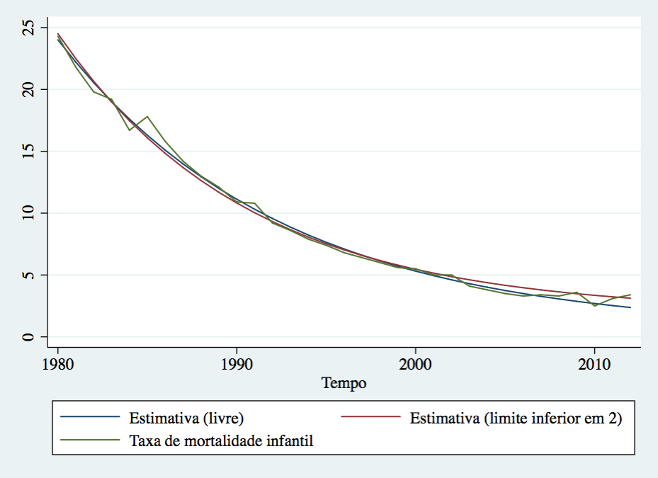 está na figura 1. Mas esse ajustamento implica que o ponto de convergência é 0,5, o que talvez seja um valor excessivamente baixo para a taxa de mortalidade infantil. Impondo que o valor mínimo razoável como média de longo prazo seja 2, obtém-se a segunda linha da figura 1.