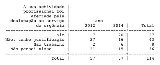 Um aspecto que se suspeita ter ganho importância nos tempos mais recentes é a preocupação com eventuais repercussões no local de trabalho de faltar para ir a serviços de saúde. Apesar dos pequenos números, essa é também  tendência verificada nesta experiência, com uma diferença grande entre os dados de 2012 e 2014. Estas diferenças entre os dois anos não são justificadas por características dos entrevistados, pois em termos de regularidade sistemática encontra-se apenas a natural de pessoas com mais idade indicarem mais frequentemente que não trabalham.