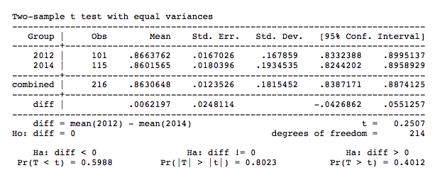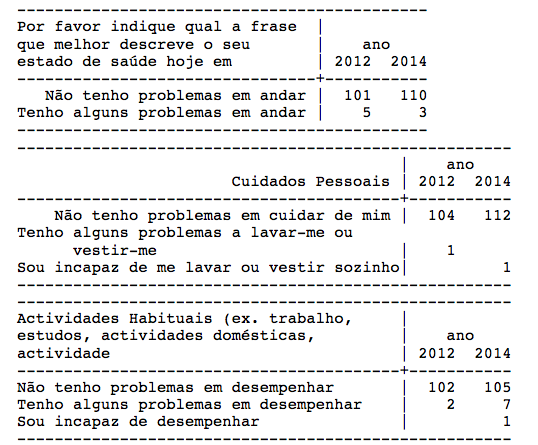 Ora, para este indicador, as diferenças entre os dois períodos não são e a hipótese de ter igual indicador na amostra de 2012 e na amostra de 2014 não é rejeitada. Os valore do indicador EQ5D são de .8663762 em 2012 e de .8601565 em 2014, sendo estatisticamente indistintos.