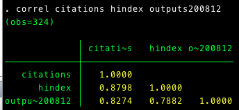 A primeira dificuldade está logo em definir o que é a “produção” de um centro de investigação. O conjunto de dados coligidos por Pedro Magalhães e Luis Aguiar-Conraria permite ter três indicadores diferentes (pelo menos): total de publicações, citações e índice-h (h publicações citadas pelo menos h vezes). Embora os resultados possam diferir de acordo com o indicador escolhido, existe forte correlação entre eles (quadro 1 abaixo), pelo que vou usar publicações e um