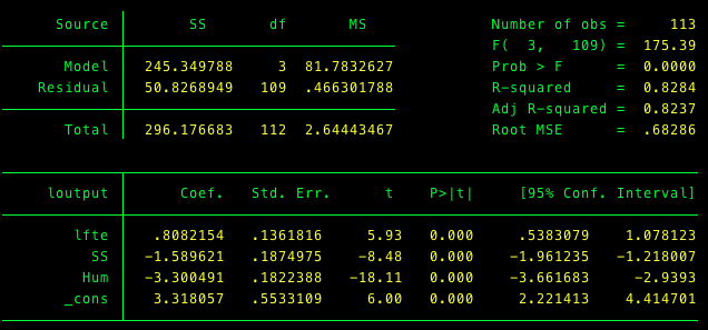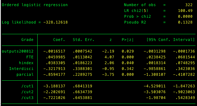 Notas: Definição das variáveis usadas – loutput= ln(publicações 2008-2012), lfte=ln (FTE- full time equivalent), parcial = membros/FTE, restantes variáveis – ver o post de Pedro Magalhães e Luis Aguiar-Conraria.