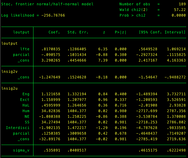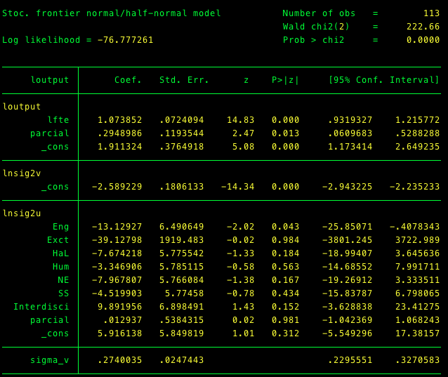 Usando uma estimações de fronteira estocástica, e apenas para a variável publicações, dividindo novamente entre centros grandes e centros pequenos (FTE maior ou menor que 25), as estimativas obtidas são suficientemente próximas de 1 para que não se rejeite essa hipótese. Ou seja, mesmo procurando distinguir os centros de investigação mais eficientes (no sentido de mais publicações para os mesmos FTE) não há evidência que aumentar a dimensão dos centros se traduza em maior produtividade por membro do centro de investigação. (quadros 5 e 6)