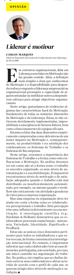 pensando numa grande empresa em particular, uma leitura recomendada – Carlos Marques – Liderar é Motivar. Para ler e interiorizar. Provavelmente aplicável a muitas empresas deste país. Provavelmente vou abrir uma série de crónicas sobre o funcionamento interno de uma empresa visto de fora. Deste artigo, ver a parte final que reproduzo “… as chefias devem ouvir os seus colaboradores e afetar as tarefas de acordo com o perfil de cada um, se querem atingir altos níveis de motivação e satisfação”. Duvido que gritar alto e humilhação correspondam a esta noção de liderança…