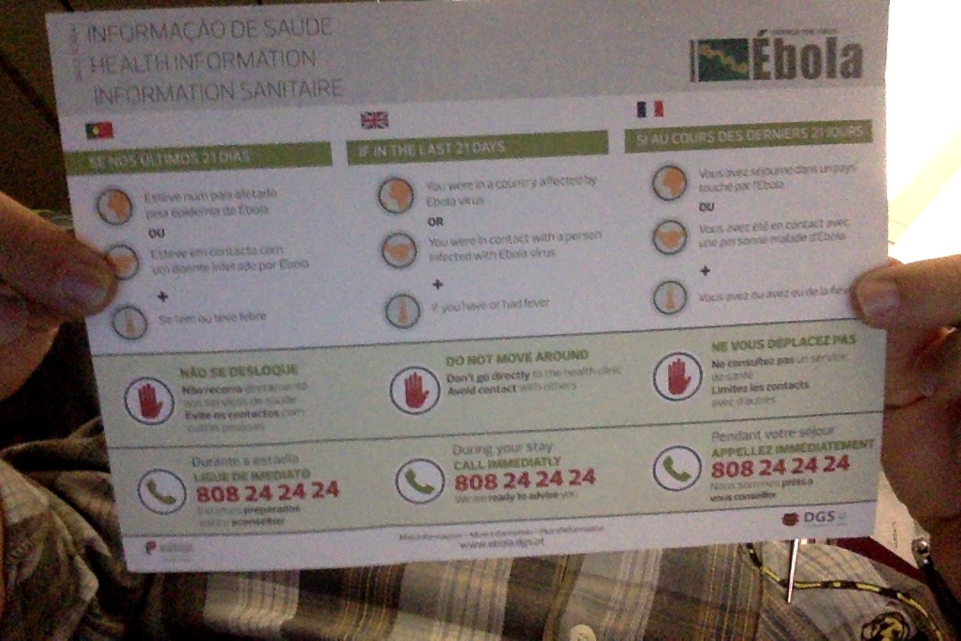 Numa recente viagem de regresso de Bruxelas, num avião da TAP, foi distribuído um panfleto, em três línguas, sobre o Ébola, a dar informações básicas sobre o que fazer, e com a indicação de um site (http://www.ebola.dgs.pt) para mais informações.