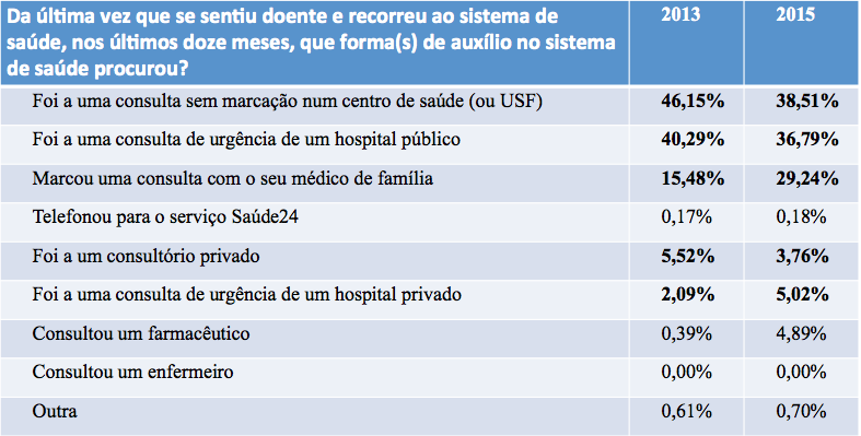 Para verificar este tipo de argumento, é útil olhar para os resultados dos dois inquéritos realizados (um em 2013 e outro em 2015), onde se perguntava às pessoas que tipo de auxilio tinham procurado no sistema de saúde, com possibilidade de indicarem mais do que uma resposta. O resultado está no quadro seguinte.