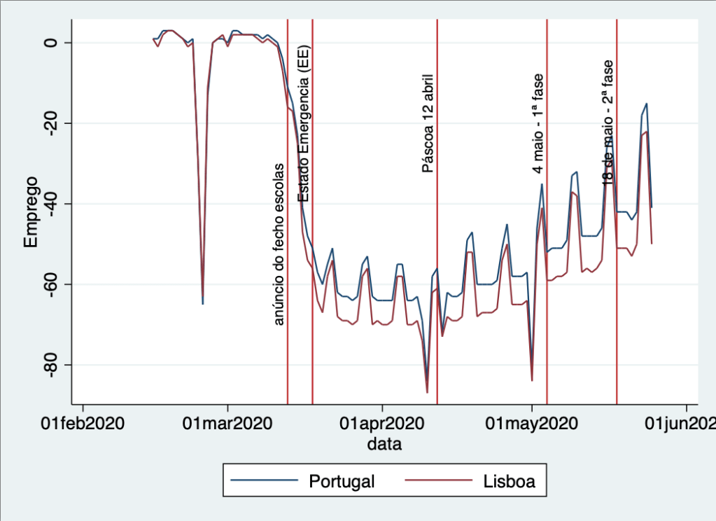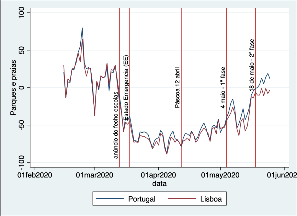 A mensagem principal é que Lisboa não está com maior mobilidade face a Portugal como um todo, se alguma regularidade existe é a situação de mobilidade das pessoas, medida pela Google, estar em Lisboa abaixo, mais contida, do que o país como um todo. Até na semana depois do inicio da segunda fase de desconfinamento, em que o calor convidou a ir à praia, de onde aliás houve várias reportagens, em Lisboa o aumento de mobilidade foi menor do que no global (sendo que pela primeira vez se teve a nível nacional maior circulação do que no mês antes das decisões de confinamento). Assim, não parece existir um problema geral de desconfinamento demasiado rápido em Lisboa, sendo mais um problema de surtos localizados, como tem sido reportado pelas autoridades de saúde.