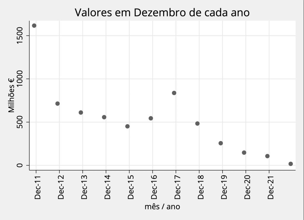 O valor do final de ano de 2022 corresponde (uma vez mais) ao valor mais baixo dos últimos anos, e é praticamente nulo. Há como que um colocar a zero dos pagamentos atraso, sendo a primeira vez que ocorre desde que há registo mensal da evolução dos pagamentos em atraso – ver o primeiro gráfico abaixo. Significa que as injeções de verbas foram suficientemente fortes para compensar o crescimento durante o ano.