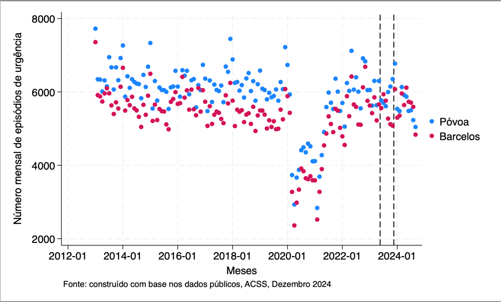 Para procurar perceber os efeitos presentes, é útil comparar a evolução do número de episódios de urgência, na urgência hospitalar da ULS PVVC face ao seu passado, mas também face à evolução de outras unidades hospitalares, para captar efeito comuns e que possam tornar menos claro se o que se observou é resultado do projeto ou de outras medidas gerais, ou de uma tendência que viesse de meses e anos anteriores. No caso da urgência da Póvoa de Varzim/Vila do Conde o ponto de comparação mais natural é com a urgência hospitalar de Barcelos (pela dimensão, pela semelhança da população servida em termos da sua demografia e pela proximidade de evolução que houve antes do início do projeto). E felizmente, durante os nove meses de dados disponíveis, a unidade hospitalar de Barcelos não estava inserida no projeto.