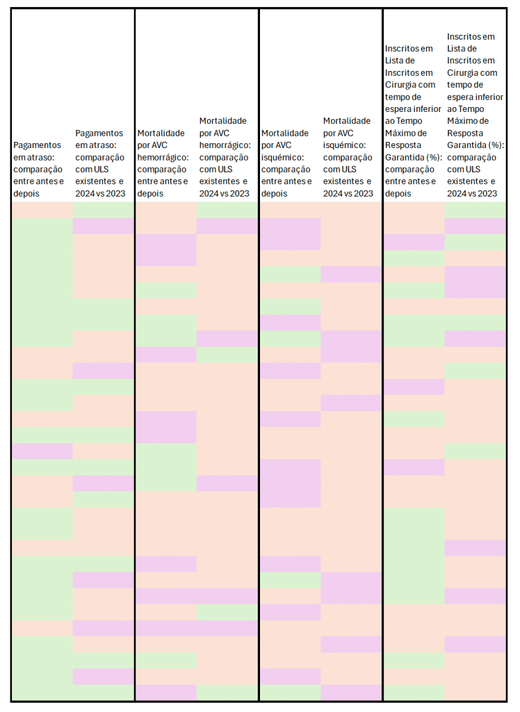 O resultado foi codificado do seguinte modo: evolução favorável assinalada a verde, sem diferença assinalável de um ano para o outro, assinalada a laranja, e evolução desfavorável, assinalada a roxo (deixando de parte, por agora, a magnitude da evolução). Esta avaliação é também relevante para compreender, ou não, alguma parte da “dança de cadeiras” em curso (e perceber o papel do mérito e da política nas nomeações realizadas, a propósito do artigo de 07/02/2025, administração pública em Saúde: entre a meritocracia e a captura política, também de Xavier Barreto).
