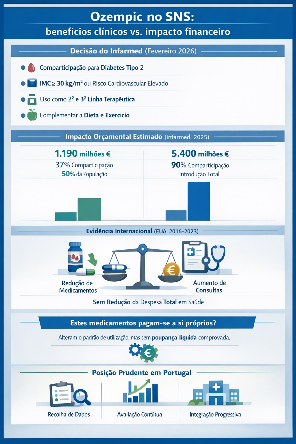 Recentemente, no início de fevereiro de 2026, o Infarmed tornou pública uma decisão: “O medicamento Ozempic (semaglutido) obteve autorização de comparticipação na indicação: tratamento de adultos com diabetes mellitus tipo 2, insuficientemente controlada, com IMC igual ou superior a 30kg/m2 ou risco elevado de doença cardiovascular, como adjuvante à dieta e exercício, em adição a outros medicamentos para o tratamento da diabetes, para ser utilizada em 2ª e 3ª linhas terapêuticas”.
