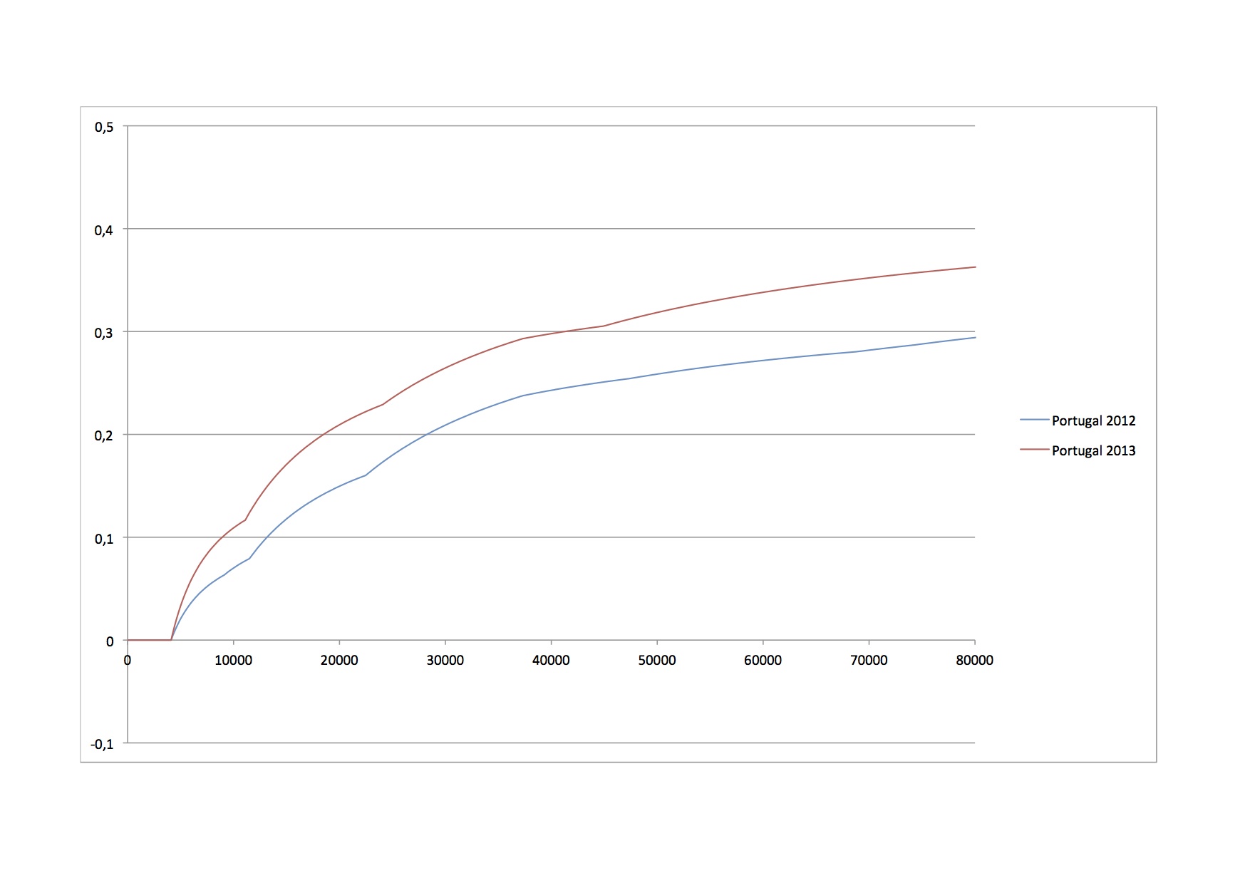 Ou seja, a proposta de escalões e taxas do governo coloca realmente um maior peso de esforço relativo nos escalões de maior rendimento. A critica de penalização dos rendimentos mais baixos não é por isso correcta.