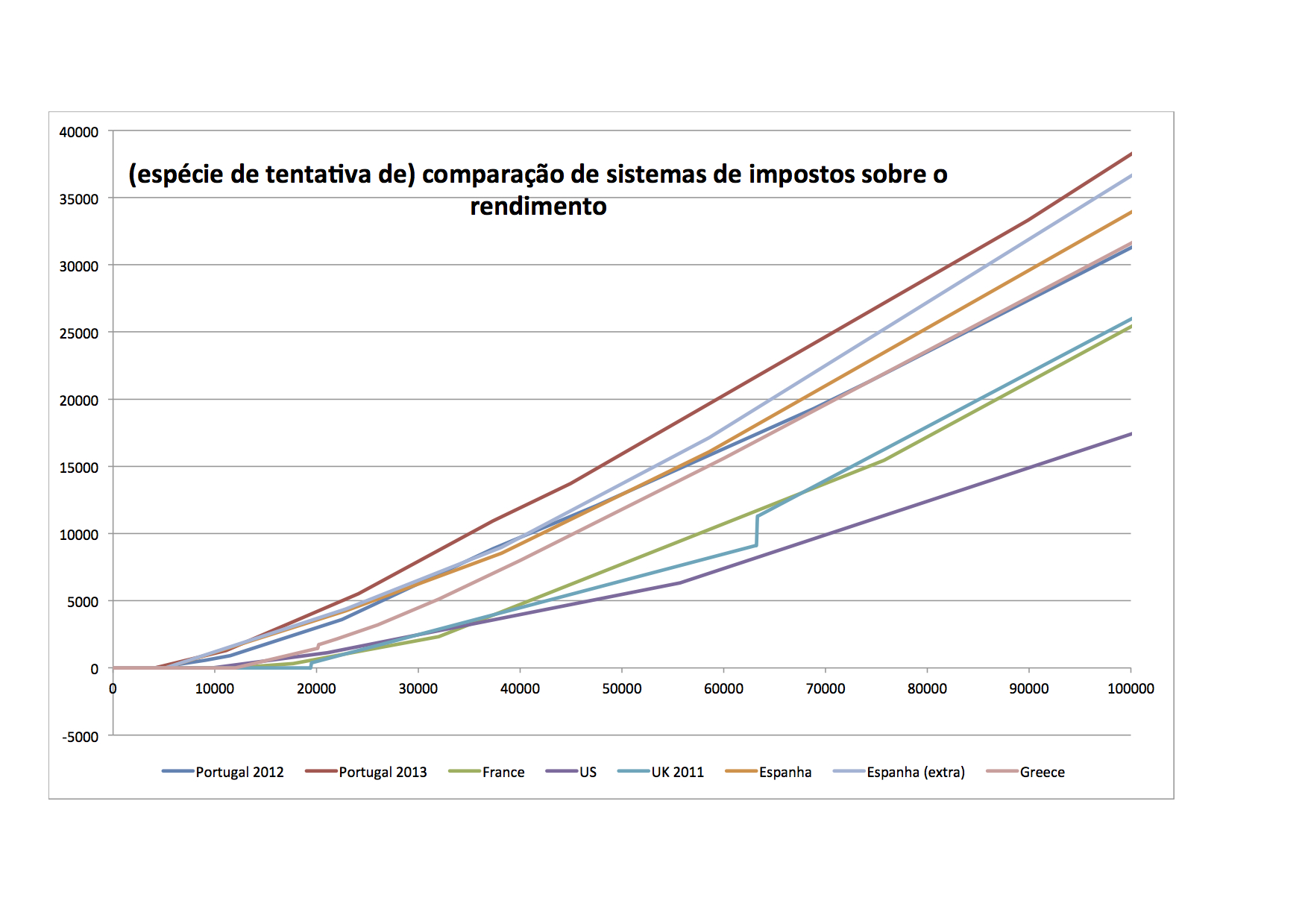 Aspecto diferente é saber se o esforço pedido é exagerado ou não. E aqui alinho com Bagão Félix no termo de sismo fiscal. Embora sem grande precisão, que não houve tempo para recolher com grande detalhe toda a informação e não conheço em detalhe os sistemas fiscais dos países, uma busca rápida na internet dos escalões e taxas marginais de imposto, bem como das deduções específicas, permite ver quanto é que cada nível rendimento paga de imposto em cada país (no caso dos países fora da zona euro usei a taxa de câmbio do dia). A inclusão das deduções específicas é relevante, pois o rendimento tributável é dado pelo rendimento auferido menos o valor dessas deduções. Por isso, quando se diz que o primeiro escalão de IRS paga 14,5% de imposto, não significa que rendimentos até 7000 paguem esse valor, é preciso retirar primeiro a dedução específica relevante (as simulações normalmente apresentadas têm este aspecto técnico incorporado, embora usualmente os quadros de apresentação do IRS só apresentem os valores dos escalões e as respectivas taxas aplicadas dentro de cada escalão – a taxa marginal de imposto).
