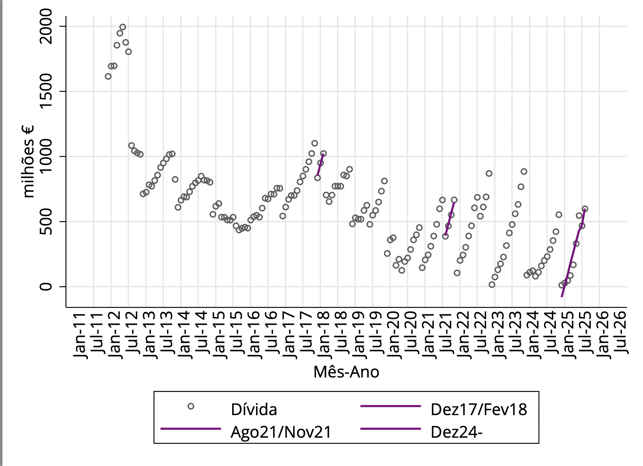 Os números mais recentes são claros. O gráfico habitual mostra a evolução dos pagamentos em atraso e o quadro resume a estimativa do seu crescimento médio mensal, isolando o efeito das transferências extraordinárias: para o ano de 2025, foi de cerca de 85 milhões de euros de acréscimo por mês.
